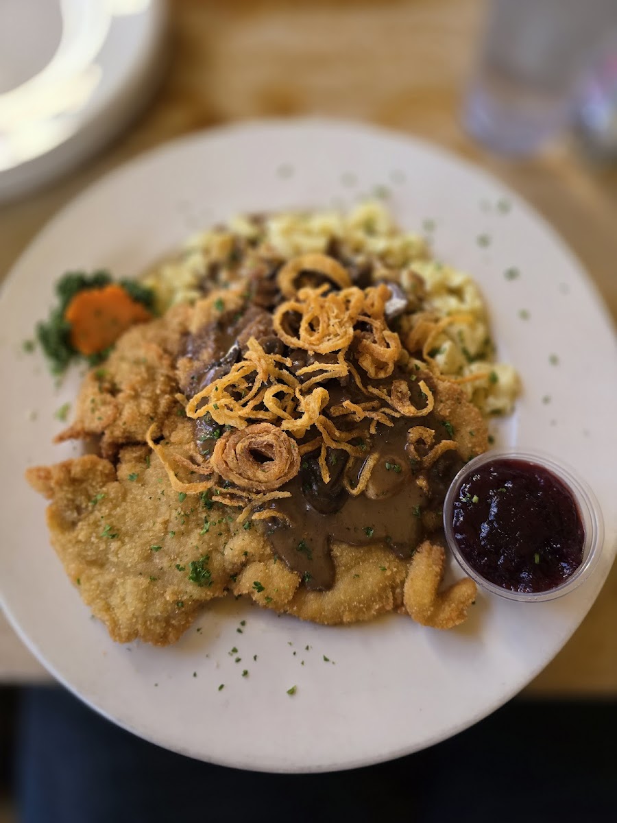 For those seeking vegetarian and vegan delights, Hofbrauhaus offers options like the Käsespätzle, a comforting bowl of special German noodles smothered in Swiss cheese and garnished with crispy fried onions, served with a refreshing side salad at $25. If you're feeling adventurous, the Veganes Schnitzel is a scrumptious breaded vegan alternative accompanied by a homemade potato-cucumber salad, cherry tomatoes, and cranberries—all for $27.